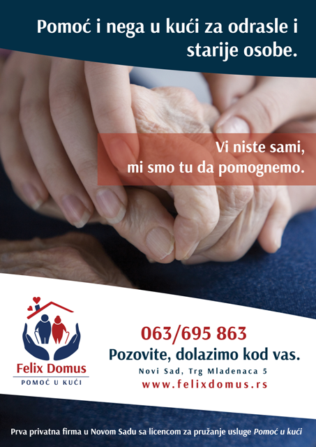 Felix Domus je prva privatna firma sa licencom za pružanje usluge socijalne zaštite Pomoć u kući za stare i odrasle korisnike na teritoriji Novog Sada i Vojvodine. Osnovani smo 2014.godine. Višegodišnje iskustvo u radu, human odnos prema korisnicima i veliki broj zadovoljnih klijenata su naša glavna preporuka.